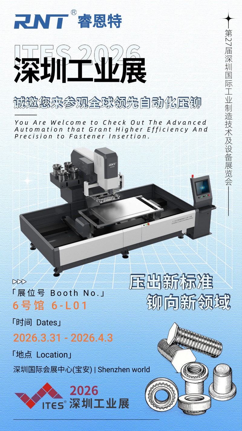 全球领先的自动化压铆设备制造商 —— 睿恩特(RNT),将携新一代全自动压铆中心(Fastener Insertion Center) 重磅亮相第 27 届深圳国际工业制造技术及设备展览会(ITES 2026),向全球客户展示高效、精密的钣金压铆解决方案。
